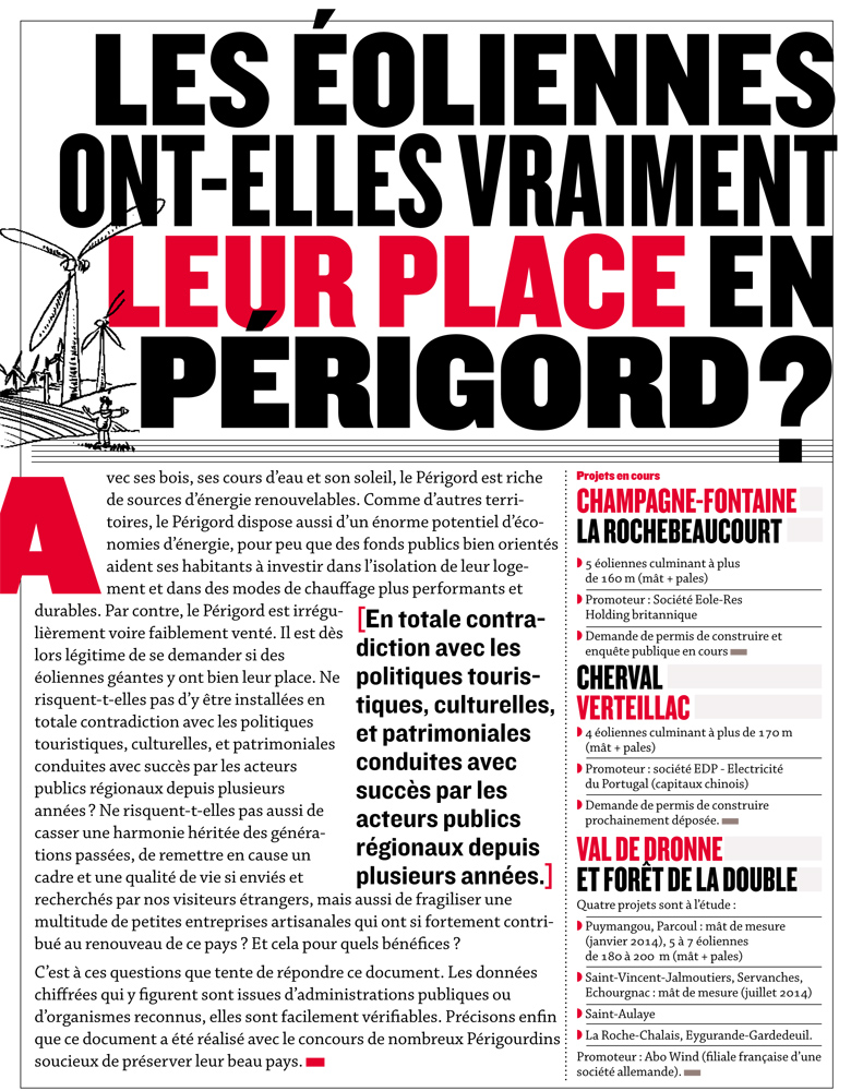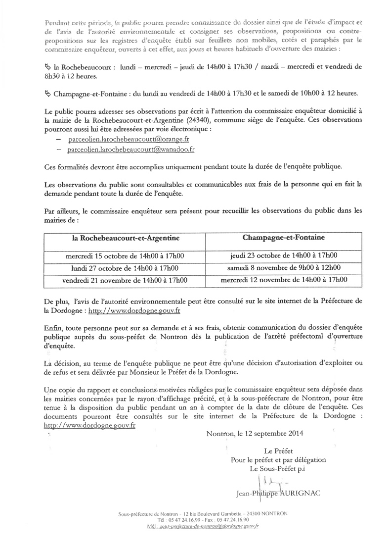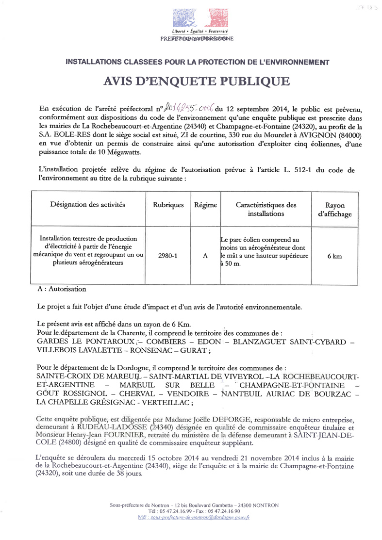 Une très bonne nouvelle :A l'attention des membres de l'association Citoyenneté et Environnement en Périgord, (source de cette information) (et de leurs amis ! dn) Une très bonne nouvelle 2 arrêtés du préfet de Dordogne, datés du 9 mars 2015, refusent les permis de construire déposés par EOLE RES pour les projets éoliens de Champagne Fontaine et de La Rochebeaucourt… A ce jour (25 mars) cette information nous a été confirmée par le responsable Urbanisme Habitat et Construction de la DDT 24. Concrètement les projets sont bloqués, EOLE RES fera probablement appel de cette décision. Pour autant ce refus de la première installation d'éoliennes en Dordogne est une grande réussite et un bel encouragement pour la suite, et notamment pour contrer le projet EDP sur Cherval/Verteillac. Merci à tous ceux qui ont réagi,